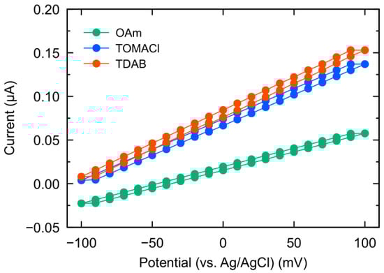 Comparison of membrane resistances in three kinds of membranes can also be helpful in estimating the degree of ionization of lipid molecules. The membrane fabricated in this study supports substances such as amine and ammonium salts ionizing in the PVC/plasticizer matrix. Therefore, the ionization of these substances at the surface and inside the membrane of the PVC/plasticizer matrix structure decreases the membrane resistance due to an increase in anions moving across the membrane, although the situation is very different from that of a complete electrolyte solution. In fact, an increase in charged lipid molecules that constitute the PVC/plasticizer matrix structure also resulted in a decrease in membrane resistance of the negatively charged membrane system [8]. Figure 4 shows the current–potential characteristics of three kinds of sensor. All sensors exhibited a linear relationship in their current–potential characteristics. Still, due to the membranes’ capacitance, their currents did not perfectly match between the case of the positive sweep direction and that of negative direction. The resistance values were 6.9 × 106 Ω·cm2 (OAm sensor), 3.6 × 106 Ω·cm2 (TOMACl sensor), and 2.9 × 106 Ω·cm2 (TDAB sensor). The resistance of the TOMACl and TDAB sensors, which are quaternary ammonium salts, is approximately half of the OAm sensor. This result supports that TOMACl and TDAB molecules become fully ionized and positively charged on the membrane interface.