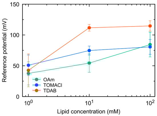Figure 5 shows the Vr of the nine prepared sensors. In the case of the OAm sensor, Vr shifted monotonically in the positive direction with an increase in lipid content. Similarly, both the TOMACl sensor and the TDAB sensor showed significant positive shifts in Vr when the lipid content increased from 1 mM to 10 mM. However, no significant difference was observed between 10 mM and 100 mM lipid concentrations. TOMACl and TDAB molecules ionize entirely in aqueous solutions regardless of the pH. However, the membrane potential was considered to saturate at high charge densities, such as a lipid content of 100 mM [13,19]. Moreover, an oil film on the membrane surface was observed in the case of the TDAB sensor with a lipid content of 100 mM. It suggests an inadequate fixation of TDAB molecules to the membrane, which may have interfered with the positive shift in membrane potential.