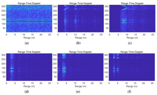 The RTD spectra. (a) Background; (b); walking back and forth along the azimuth direction; (c) walking back and forth along the distance direction; (d) marking time; (e) standing alone; (f) two people standing.