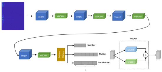 An overview of the network architecture for people counting, motion recognition, and static human localization is shown in Figure 3. The network is an end-to-end architecture composed of three modules: the backbone network, attention module, and confidence matrices for three tasks. As shown in Table 1, ResNet34 [39] is selected as the backbone network, with an MSCAM inserted after each ResNet stage. Initially, the network takes the RTD as input, passing it through a sequence of convolutional layers and MSCAM, thereby yielding enhanced feature representations. Subsequently, global average pooling is applied to integrate global high-level semantic features. Lastly, softmax layers are employed to transform the feature maps into confidence matrices for the tasks of people counting and motion recognition, with a sigmoid layer utilized to derive the predicted distance confidence matrix for static human localization.
