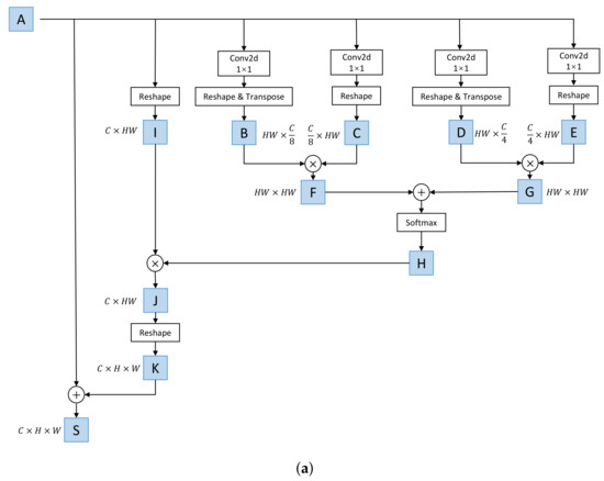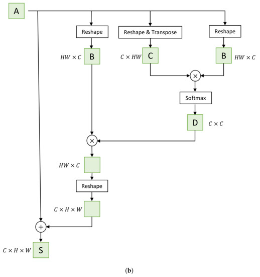 CAM [40] is shown in Figure 4b. Similarly to MSAM, we define the local feature as , but we directly reshape it as , where . Matrix multiplication is performed between , which is the transpose of , and . After applying a softmax layer, we obtain the channel attention map (). Then, we perform matrix multiplication between and and reshape the result to , then add it to to obtain the final output () as follows: