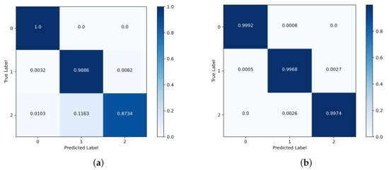 The experimental results are shown in Figure 6. Based on test set 1, the detection rates of zero, one, and two persons reach 100%, 98.86%, and 87.34%, respectively. Meanwhile, based on test set 2, the detection rates for zero, one, and two persons are 99.92%, 99.68%, and 99.74%, respectively. As the distance between the targets and the radar increases, the amplitude of the target echoes gradually diminishes. In the through-wall scenarios of two people standing, the distant target may also experience partial occlusion by the foreground target and be occluded by the wall, resulting in further attenuation of their Doppler features and posing challenges for target recognition.