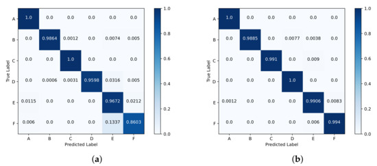 Confusion matrix for each motion. Classes codes represent six motions: A for background, B for marking time, C for walking along the range direction, D for walking along the azimuth direction, E for standing alone, and F for two people standing. (a) Test set 1; (b) test set 2.