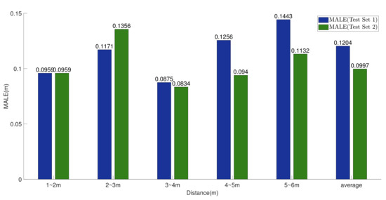 Figure 8 presents the MALE of our method at different distances, indicating that our model has localization errors of 0.1204 m and 0.0997 m on test set 1 and test set 2, respectively. The localization error at 2–3 m based on test set 2 is relatively large, which is due to the multipath effect caused by the raised walls and ventilation pipes on the ceiling at 2–3 m in certain scenes.