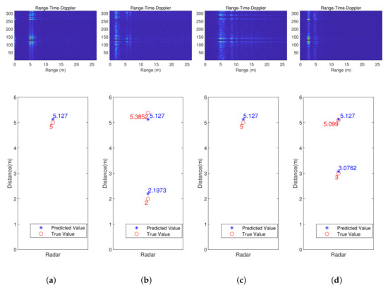 Figure 9 displays the RTDs and the predicted localization results of the network proposed in this paper. The predicted results in the bottom row show people’s location coordinates and their corresponding true positions. The two columns on the left are the results on test set 1, showing the network’s capability of pinpointing multiple individuals. The two columns on the right are the results achieved on test set 2. The results illustrate that our method has good localization ability within the range of 5.5 m.