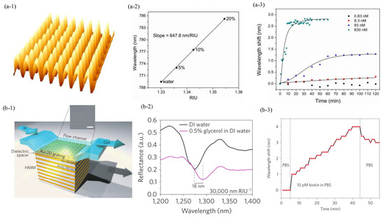 | Au grating/(Au/ multilayer HMM) [53] | 1250 | 30,000 nm/RIU | 10 pM (biotin) |