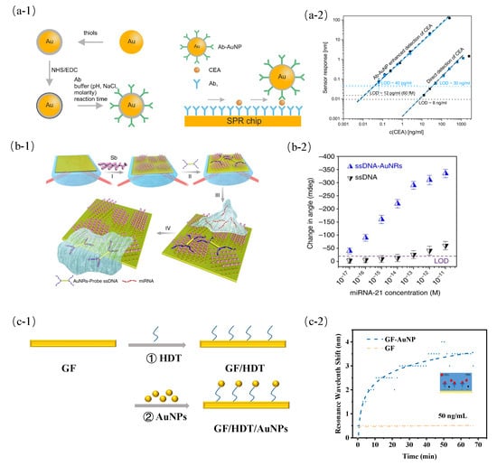 - Li, R.; Feng, F.; Chen, Z.Z.; Bai, Y.F.; Guo, F.F.; Wu, F.Y.; Zhou, G. Sensitive detection of carcinoembryonic antigen using surface plasmon resonance biosensor with gold nanoparticles signal amplification. Talanta 2015, 140, 143–149. [Google Scholar] [CrossRef]