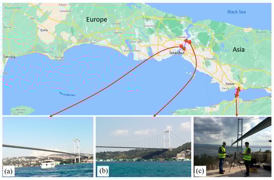 An overview of the tested long-span bridges in Turkey: (a) the First Bosphorus Bridge, (b) the Second Bosphorus Bridge, and (c) the Osman Gazi Bridge.