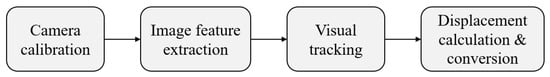 The idea of the computer vision-based displacement measurement method is to use computer vision to track the motions of selected monitoring targets from the video or image sequences recorded by cameras, calculate the location changes of the targets, and convert the location changes in pixel units to displacements in physical units by using the camera calibration information [11]. Figure 2 shows a flowchart of the computer vision-based displacement measurement method using feature matching. Generally, there are four steps in the procedure of extracting displacement using computer vision. First, camera calibration is conducted to determine the relationship between the camera and the real world. Second, image features are selected and extracted for visual tracking. In this step, the measurement targets are also selected in the image. Third, visual tracking is performed in the recorded video/image sequences to obtain the motion of the targets. Finally, the displacements of the targets in images are extracted from the visual tracking results by calculating the location changes of measurement targets in pixel units in images. The actual displacements of measurement targets in the real world can be obtained by converting the displacement in pixel units in images to the physical units such as millimeters in the real world with camera calibration information.