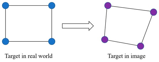 There are three main approaches to conducting camera calibration for displacement measurement purposes: (1) scale factor, (2) full projection matrix, and (3) planar homography matrix. The scale factor method is convenient and easy to use, especially when the camera axis is perpendicular to the target plane. When there is an angle between the camera axis and target plane, the scale factor has to be revised by using geometric calculations. More details can be found in Reference [14] and Reference [36]. Full projection matrix is a detailed camera calibration method which is required to conduct a series of tests to obtain the intrinsic and extrinsic parameters for the full projective transformation between the image and the real world. It is a comprehensive way to find the relationship in 3D between the image and the real world, but it may not be convenient for displacement measurement in field application, especially for the long-span bridge application with the measurement distances over hundreds of meters. The planar homography matrix is a practical way to build the connection between image and real world, especially for displacement measurement of civil structures where the monitored targets generally move within a plane. The planar homography transformation is a degraded version of full projective transformation from 3D to 2D. The planar homography matrix method also considers the angle problems when the camera axis is not perpendicular to the target plane. As shown in Figure 3, a rectangular target, marked by four blue points at its vertices in the real world (left side), is projected onto the image (right side). Due to the different plane orientations between the real rectangle and the camera, the target’s shape appears distorted in the image, no longer maintaining its rectangular form. This altered shape is denoted by the purple points in the image. This projective change can be presented by the planar homography matrix, H. The mapping from the target in image to real world can be built by multiplying the matrix H on the left of the points of the target in the image. To obtain the H matrix for the mapping, at least four point correspondences are required. The detailed derivation with equations can be found in reference [11]. For the case studies of long-span bridges presented in this paper, the manual targets and bridge guardrails with known dimensions can be used to build the planar homography matrix.