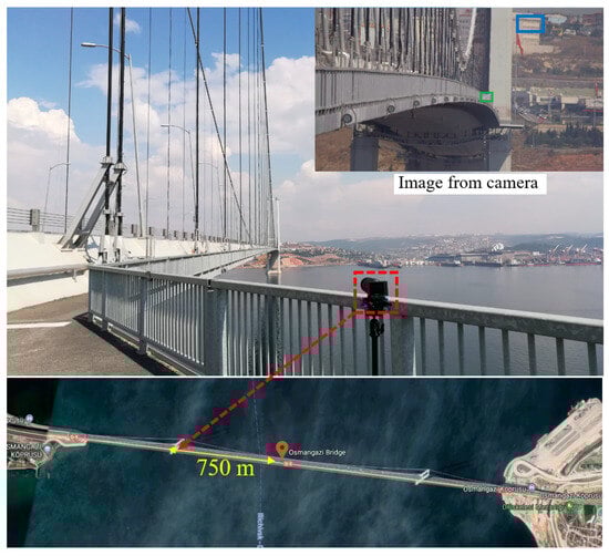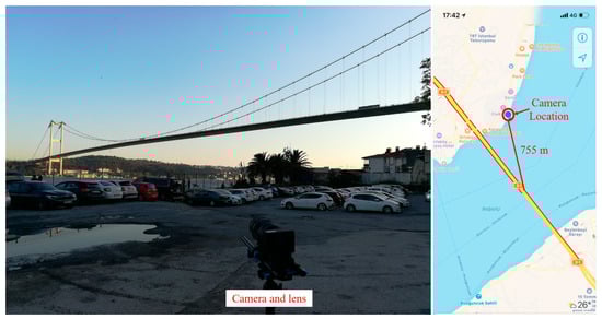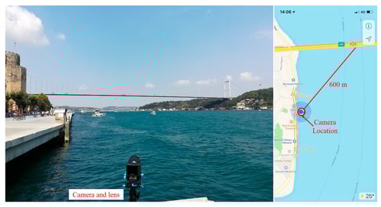 Figure 4 shows the experimental setup of the computer vision-based structural displacement monitoring of the First Bosphorus Bridge. The experiment was conducted during the afternoon of 15 September 2018, at local time. A camera (Z camera E1, Z CAM, Shenzhen, China) with a resolution of 4K (3840 × 2160 pixels), a frame rate of 30 frames per second (FPS), and a 75–300 mm zoom lens (Olympus M.Zuiko ED 75-300 II, Olympus Corporation, Breiningsville, PA, United States) was set up on the European side, north of the bridge. The distance between the camera and the bridge’s midspan is roughly 755 m, as measured using Google Maps.