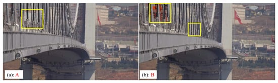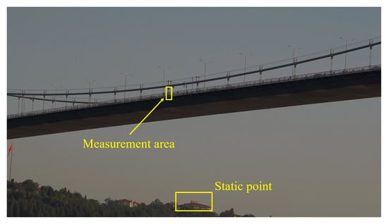 Figure 5 shows the captured image from the camera for displacement measurement. The guardrail and edges of the deck on the midspan of the northern side of the bridge was selected as the tracking target (marked as measurement area) as shown in Figure 5. During the experiment, the wind caused the camera to shake throughout. According to data from a nearby weather station (Sariyer, TU) [38], the maximum sustained wind speed was 1.8 km/h and gust was 15 km/h, as a general reference for the wind conditions. The wind and gust at the camera’s location might be larger than that at the weather station. A building in the background was regarded as a static point of reference and was selected to mitigate the camera motion problem by using background subtraction. The experiment was conducted on a Saturday afternoon, and at that time (around 5 p.m. to 6 p.m.), the traffic was becoming very busy, and the light was decreasing. Tracking the guardrails over a long distance was quite difficult.