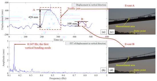 Displacement results of the midspan of the First Bosphorus Bridge: (a) vertical displacement time period at midspan, (b) FFT of displacement in vertical direction, (c) image of the traffic event A related to the displacement measurement, (d) image of the traffic event B related to the displacement measurement.