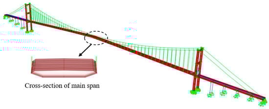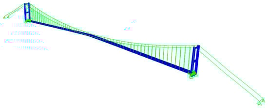 In this experiment, there was no direct comparison of the displacement measurement with other types of displacement sensors. To verify the feasibility for the applied computer vision-based displacement measurement system, a 3D FE model was developed in SAP2000, and the FE model was based on the as-built drawings and the most updated status after the hanger replacement, as shown in Figure 7. The deck of the main span, the tower, the portal beams, and the approach viaduct deck consisting of a steel box girder and hand-built steel cross I-beams were modelled with shell elements. The approach viaduct columns with circular box section were modelled with frame (beam) element. The cable elements, hanger, back-stay, and main cables are developed by the cable properties, including sag effect. The developed FE model was verified with SHM data and the experimental results presented in reference [39], which were from accelerometers. More details of the 3D FE model of the bridge can be found in the previous work [37].