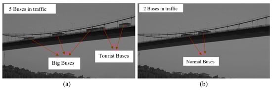 Figure 8a,b include some notes and markups about the observations, and we made certain estimations of buses and cars based on our observations of the local traffic. We list the three most common bus types and their estimated load configurations in Figure 9, with both fully loaded and empty status: (a) big bus, (b) normal bus, and (c) tourist bus. We also assume that there might be cars in other lanes, and we use compact cars with 1.2 tons to represent the assumptions. In traffic event A, as shown in Figure 8a, there were three big buses and two tourist buses, while in traffic event B, as shown in Figure 8b, there were two normal buses. It should be noted that from the images, we can only see the big buses in the lanes towards Europe which were close to the camera side. For the lanes towards Asia, they may be occupied by other large buses which are not visible from the ground-based camera.