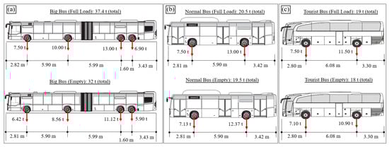 The bus load configurations used for FE analysis: (a) big bus with full load and empty status, (b) normal bus with full load and empty status, (c) tourist bus with full load and empty status.