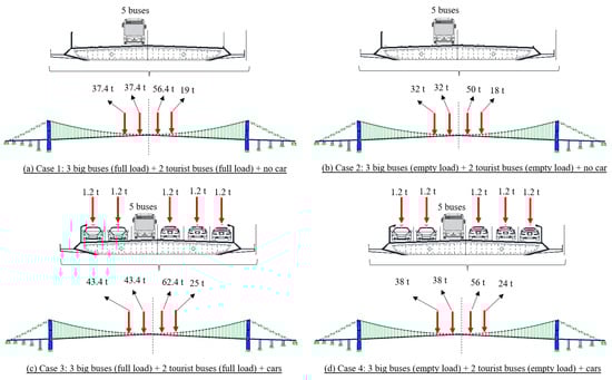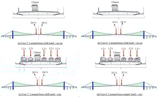 For the approximation of the possible traffic conditions, we assumed four different cases for traffic events A and B, as shown in Figure 10 and Figure 11, respectively. Taking traffic event A as an example, Case 1 and Case 2 represent the cases that only buses occupied the lane but with full load and empty status, respectively. In Case 3 and Case 4, in addition to the buses set in Case 1 and Case 2, small size cars are used to occupy the lanes in the same cross-section with the buses. The traffic configurations of traffic event B, Cases 5 to 8, are similar to the settings of Cases 1 to 4 of traffic event A. The multi-axle load of each vehicle was combined as a concentrated load, considering that the length of the vehicle is much smaller than the length of the bridge span. Additionally, only static analysis was conducted at the time of the traffic jam because traffic was stop-and-go during the data collection period.