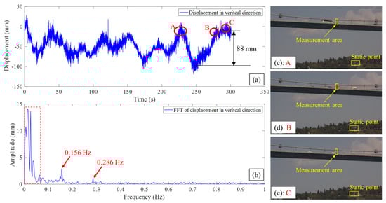 Figure 13 shows the displacement results of the mid-span of the Second Bosphorus Bridge. The largest displacement in the time period is 88 mm. There was no traffic jam during this monitoring. Three traffic events are marked as A, B, and C in Figure 13a, and there were large buses, trucks, and other vehicles crossing the midspan in each marked traffic event in Figure 13c–e, respectively. Compared the deflections with the First Bosphorus Bridge, the deflections here were smaller. The possible reason is that, at the time of the experiment, there were fewer vehicles crossing the bridge. It should be noted that the displacement refers to the change in position of the monitoring target from the reference point. The reference point is established at the beginning of the measurement, specifically at the 0th second. Given this definition, the recorded displacement can be positive, negative, or zero, contingent upon the direction of movement compared to the reference point or the initial condition of the measurement, as shown in Figure 13a.