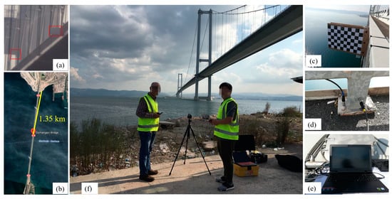 Experimental setup of the first experiment of the Osman Gazi Bridge: (a) image from camera (The red boxes, from left to right, indicate the static point and the installed chessboard, respectively), (b) camera location in map, (c) wooden chessboard, (d) accelerometers in vertical and horizontal direction, (e) computer for data acquisition, (f) camera setup.