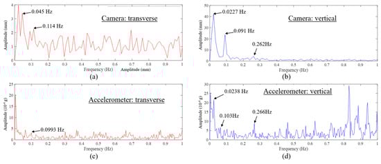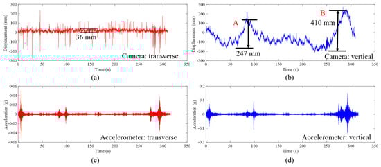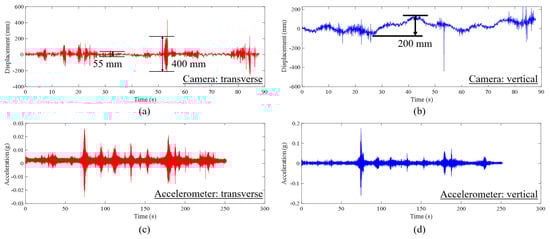 Figure 16 shows the displacement and acceleration results obtained from the camera and accelerometers. From Figure 16a, it can be seen that the maximum displacement in the transverse direction was 400 mm and in the vertical direction was 200 mm. The total durations of the data from camera and accelerometers are around 90 s and 250 s, respectively. The data acquisition system of the accelerometers started early and ended later than the cameras, so that the data duration of the computer vison-based measurement is within the range of the duration of the accelerometers. Direct comparison of the displacement magnitude is not conducted here; instead, only a comparison of the frequency domain is performed.