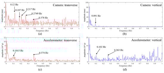 Results of the first experiment on the Osman Gazi Bridge in the frequency domain: (a) FFT of transverse displacement from vision-based method, (b) FFT of vertical displacement from vision-based method, (c) FFT of transverse acceleration from accelerometer, (d) FFT of vertical acceleration from accelerometer.