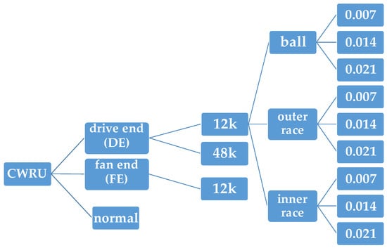The experimental platform comprises a motor, a torque sensor, a power tester, and electronic controllers. The rotating shaft of the motor is supported by the bearings under test. The drive-end bearing is SKF6205, with sampling frequencies of 12 KHz and 48 KHz, while the fan-end bearing is SKF6203, with a sampling frequency of 12 KHz. After measurement, the experimental data are processed into mat files containing the vibration data for both the fan- and drive-end bearings as well as the motor speed information. The final sample data include 4 normal samples, 77 outer-race damage samples, 40 inner-race damage samples, and 40 rolling-body damage samples. Each sample mat file contains drive-end accelerometer data, fan-end accelerometer data, base accelerometer data, time-series data, and revolutions-per-minute values. Among them, a one-dimensional time-series signal was mainly utilized in this paper. The classification of bearing faults includes three types: the inner raceway, outer raceway, and rolling element. Each type is further divided into different cases based on the fault diameters (7 mils, 14 mils, and 21 mils). Overall, nine distinct fault types exist in addition to the normal conditions, resulting in ten possible classifications for bearing faults. The specific classifications of bearing faults are shown in Figure 3.