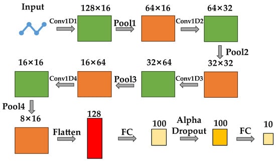 In Figure 5, the numerical value in each step represents the output size of the corresponding layer. The input denotes a one-dimensional signal from the CWRU dataset, while “Conv1d” refers to one-dimensional convolution. One-dimensional convolution involved performing a sliding-window operation on the one-dimensional input and utilized the input data within the convolutional window to compute an output value. As it operated only along the width of the data, its result was a two-dimensional sequence. For instance, 128 in “128 × 16” in Figure 5 represents the width of the output, while 16 indicates its depth or the number of channels. “Pool” refers to max pooling; “flatten” denotes the flattening operation, which transformed the two-dimensional data into a one-dimensional form; “FC” denotes the full connection layer; and “Alpha Dropout” refers to the dropout layer.