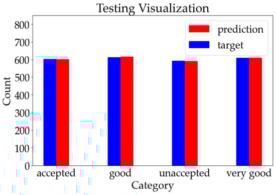 Considering the simplicity of our network structure and the limited dataset size, we chose a batch size of one to ensure that each data point could undergo iteration during training. For evaluation purposes, half of our available data were allocated for training, while the remaining half was reserved for testing. In the FTRL optimizer, l1 regularization was set to 0.001, l2 regularization was set to 0.1, the alpha value was set to 0.1, and the beta value was set to 1. The specific reason for this is that, among these four hyperparameters, the alpha value regulates the update amplitude of each step during optimization iterations within a typical range of values between 0.1 and 1. A higher alpha value will lead to sparser feature weights; therefore, a conservative choice of setting it to a lower bound, such as 0.1, ensures better control over the training process. The beta value governs model sparsity and typically ranges from 0.1 to 1; however, it is commonly set to 1 to maintain an appropriate early learning rate without excessively hindering the training progress. L1 and l2 are utilized for regularization control, with parameter values usually selected in the range of 0.0001 to 1. Based on the insights gleaned from the literature sources [38] combined with the extensive experimentation conducted on our own datasets, we empirically determined that l1 should be set to 0.001, while l2 should be set to 0.1. With the appropriate values assigned to the learning rate and various parameters of FTRL, the accuracy of the training process gradually and smoothly improved until it reached a stable state after a certain number of iterations. Since each training process involved only one set of data and was relatively independent, the accuracy and loss value of the training process do not have substantial significance for the final classification results. They can only be maintained as records in the actual production process to facilitate subsequent inspection and sorting. The final test classification results are shown in Figure 6.