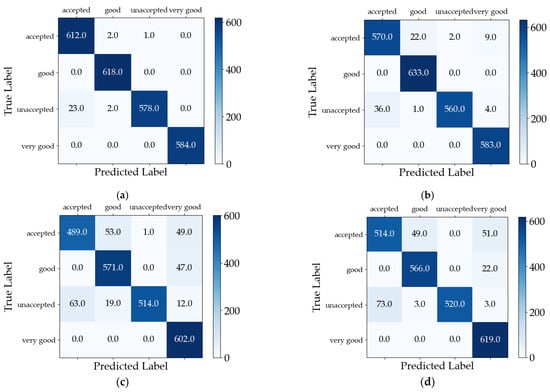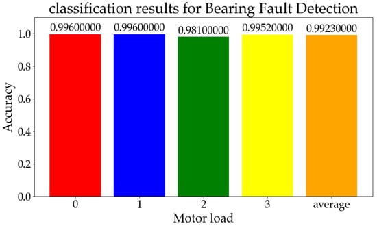 The batch size and FTRL optimizer parameters remained consistent with those in Section 3.3.1, while the training sample proportion was adjusted to 50%. The fault types in the CWRU test set were categorized into four distinct levels based on horsepower, namely, levels 0, 1, 2, and 3. Consequently, it was imperative to conduct separate classified tests for each level. The final classification results based on horsepower are shown in Figure 8.