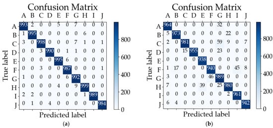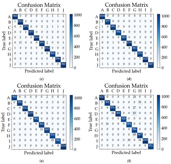 We validated multiple techniques by utilizing the structure and parameters presented in the partial references, which were tested on the CWRU dataset, resulting in the experimental data. The theoretical results claimed in the introduction of the original paper were supported by our tests, demonstrating a recognition accuracy comparable to those reported in the literature. The classification results obtained from testing these methods on the CWRU dataset are depicted in Figure 9 using confusion matrices. The correspondence between the category labels and letters can be found in Table 2.