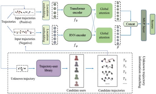 Solving the problem of user re-identification can involve adopting general classification methods, such as longest common subsequence (LCSS), edit distance on real sequence (EDR), dynamic time warping (DTW), and other methods based on trajectory similarity. Another possibility is creating a solution based on a deep neural network model. Ref. [15] first used deep learning models to deal with trajectory–user link problems. The embedding method is used to embed the user-generated position into the vector space, and the recurrent neural network model is used to model the trajectory information. Because RNN can input a variable-length trajectory sequence and capture the long-term dependence of the position, the result achieves good performance. The TULVAE [16] model improves on the former model by learning high-level semantic information regarding trajectories and using semi-supervised learning to improve linking capabilities. Following this, ref. [17] proposed an end-to-end attentional circulation neural learning framework (TULAR). Despite the effectiveness of the current methods, they struggle to make accurate predictions at a high level, for the following reasons: (1) check-in data are sparse. User check-in data generally do not have a fixed frequency and rules, which can lead to noise or abnormal values. These problems have presented huge challenges to re-identification tasks. (2) The existing models struggle to distinguish between similar embedding vectors and cannot capture the dependency of the trajectory sequences. (3) Most models lack effective use of historical trajectories. Establishing how to effectively use historical trajectory information is also a major challenge.