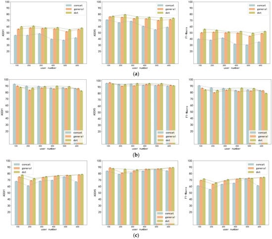 To study the impact of the three forms of global attention on our model, we selected 100–600 users from three datasets for our experiments. In Figure 2a, as the number of users increases, the performance of the model first improves and then decreases. The performance of the model is lowest when the number of users is 500. This may be due to the excessive increase in the number of users, resulting in more candidate trajectories, making it difficult for our model to correctly identify anonymous trajectories. It can also be seen from Figure 2a that the attention mechanism in the form of the dot is better than general and concat. As seen in Figure 2b, as the number of users increases, the model performance drops slightly. Based on the Foursquare dataset, the effect of the three forms of attention mechanism is not very different. As seen in Figure 2c, when the number of users is 200, the model performance reaches its lowest. Afterward, as the number of users increases, the performance of the dot and general attention mechanism models improves. However, the performance of the attention mechanism model in the form of concat drops sharply when the number of users is 600. This may be because when the number of users is 600, it is difficult for the attention mechanism model in the form of concat to distinguish trajectories in the Weeplaces dataset. Also in the Weeplaces dataset, the attention mechanism model in the form of the dot is better than general and concat.