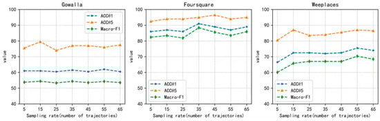 We evaluate the influence of different sampling frequencies of the data on the model, as can be seen in Table 6. The model with a sampling interval of one week has the lowest accuracy, which may be due to the decrease in the number and length of trajectories, making it difficult for the RNN model to learn inter-trajectory dependencies. In addition, the weekly trajectory information also includes weekend information, resulting in more noise redundancy. The spatial distribution of user check-in data is broad, and the randomness of check-in location is strong. For the Gowalla and Foursquare datasets, they are sampled at intervals of a day when there are fewer users, which is more accurate. When there are many users, sampling at 6 h intervals is more accurate.