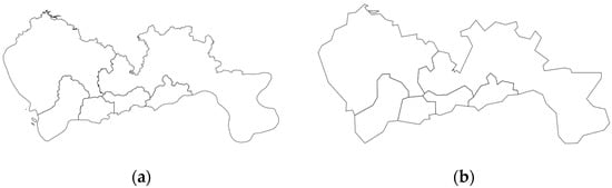 Applying Ramer–Douglas–Peucker line simplification algorithm to the administrative polygons representing Shenzhen city in China by using number of points to retain, which is equal to roughly 2%, which means we retain 2 percent of the total number of points from the original lines that are constituting the borders and the administrative separating lines of the polygons. (a) before applying the RDP algorithm; (b) after applying the RDP algorithm. For (b), the edges of the outskirt lines and the separating lines are sharper than those in (a).