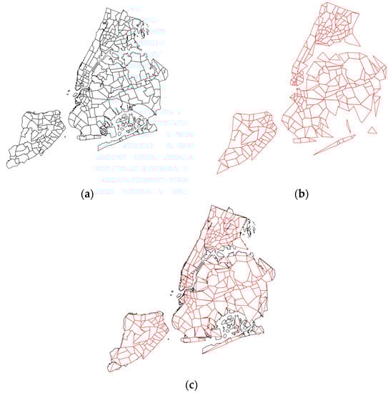 Applying Ramer–Douglas–Peucker line simplification algorithm to the administrative polygons representing NYC city in USA by using number of points to retain, which is equal to roughly 1%, which means we retain 1 percent of the total number of points from the original lines that are constituting the borders and the administrative separating lines of the polygons. This simplification is considered aggressive and may result in elimination of few polygons, as shown in (c). (a) shows original NYC polygon map, while (b) shows reduced NYC polygon map with RDP algorithm applied at number of PTR that is equal to 1%; in (c), we show the original NYC polygons map overlayed with reduced NYC polygons map with Ramer–Douglas–Peucker (RDP) applied with number of PTR that is equal to 1%.