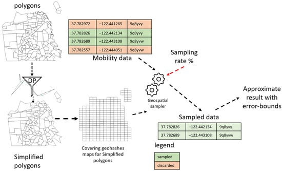 In more detail, the geohash cover list size is reduced from 1730 to roughly 1471 in the case shown in Figure 5, a reduction that roughly equals 14.9%. The output of this component is a list of geohash values covering the reduced polygons file. This acts as a dictionary to define the stratum of the strata that covers the city area. In this case, each geohash value is a stratum, and all geohash values covering the city are strata. We then pass this cover as a dictionary to our geohash-based stratified-like geospatial sampler component. Our sampler works as follows. It groups geospatial tuples in the database (e.g., vehicle mobility data) by their geohash values, and then it selects from each geohash group the same percentage of tuples (e.g., 0.2). In other terms, it selects a percentage of points that corresponds to the sampling fraction from each geohash (equivalent to stratum) independently. It is a stratified-like sampling design that is known to yield better results in terms of accuracy-based QoS constraints. The remaining points are then fed to a geospatial approximator downstream in the processing pipeline so that they participate in generating a response to the continuous geospatial query request stepwise. The approximator currently supports two widely spread geospatial queries, which are Top-N and single geo-statistics (such as ‘mean’ and ‘count’). Algorithm 1 shows the mechanism by which GeoRAP operates.