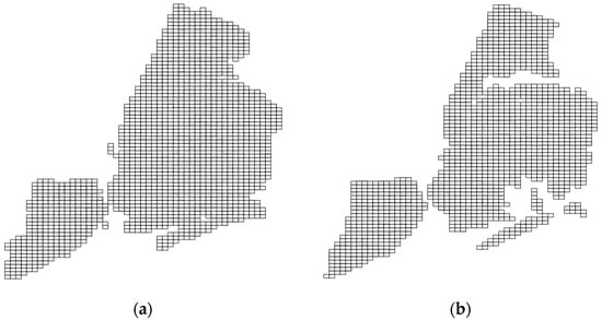 We then pass this new vector geospatial polygons file to a geohash encoder component, which then generates a list of geohashes completely covering the study area (e.g., city), as shown in Figure 5, with Figure 5a showing the covering geohash at precision 6 for the original polygon file of NYC in the USA, while Figure 5b shows the covering geohash for the reduced polygon file that was subjected to the front-stage RDP-based filter previously.