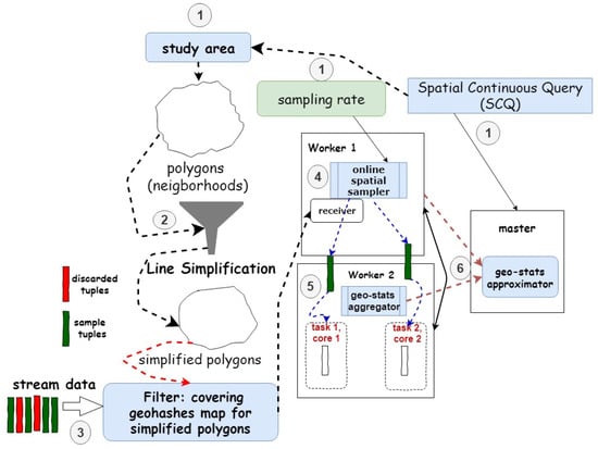 Unprecedently, massive amounts of big, geotagged data streams are hitting database management systems (DBMSs) continuously, with fluctuations in such a way that in peak hours, data size typically overwhelms those systems and far exceeds their computational capacity [,,]. Seeking to derive insights from such data [], DBMSs need to manage and store such data efficiently. In such cases where size is overwhelming, systems resort to either elasticity or adaptivity []. In the former, systems overprovision or deprovision resources depending on the fluctuation in data arrival rates, whereas in the latter, systems resort to applying approximate query processing (AQP). The disadvantage of elasticity is that it keeps the online DBMS busy with configurations while those resources can be better allocated to data stream processing instead.