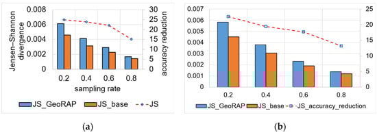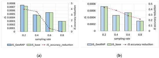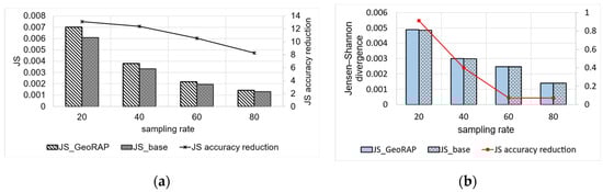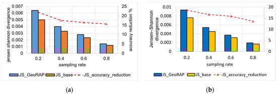 Jensen–Shannon (JS) divergence GeoRAP against plain baseline, NYC low-cost air quality data. (a) at geohash precision 6 and PTR 4%; (b) at geohash precision 6 and PTR 80%.