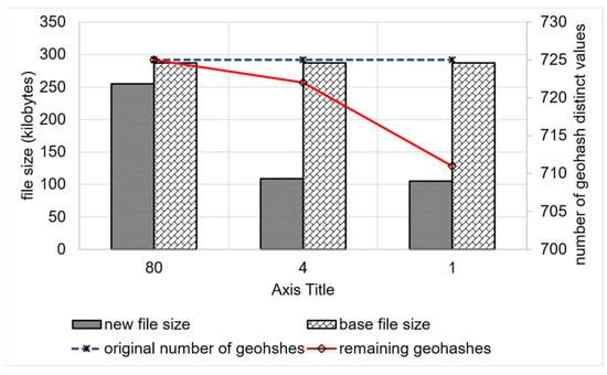 Also, there is a reduction in the number of geohash distinct values covering the remaining embedding area (which is desirable) to reach its lowest, which equals 711 at a PTR that equals 1%. This is significant for performing the kind of spatial join queries that rely on the filter-and-refine approach. It is worth mentioning that the original number of geohash distinct values is 725. Despite being a roughly small difference, it significantly contributes to lowering the running time of Top-N and count queries, as shown in Figure 14.