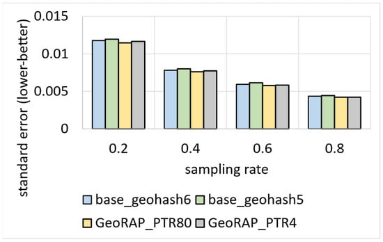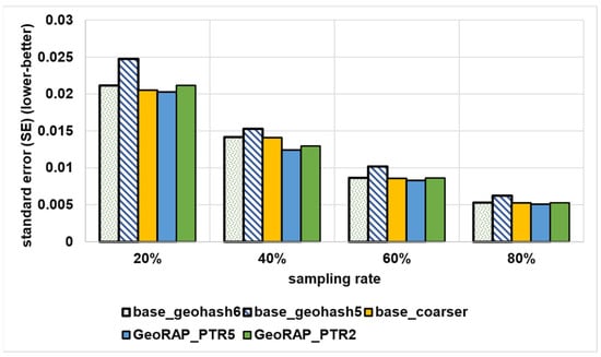 The standard error (SE) increases with a smaller “number of PTR”. So, at 2% “number of points to retain”, we obtain an increase in the standard error that is equal to roughly 4.25%, on average, as compared with the ‘number of PTR’ 5%. This is expected as the percent of 2% is a very aggressive simplification, saving a huge amount of hard disk space, but at the same time increases the standard error slightly. However, this tiny increase in the SE is still statistically acceptable as the algorithm at this point is still on par with the baselines of stratified-like sampling without simplification at geohash precision 6 and stratified-like sampling at the same geohash precision with the coarser level of stratification at the neighborhood level, while outperforming stratified-like sampling with no simplification at geohash precision 5 by a plausible magnitude. In more detail, the data that have been discarded mostly belong to the borders, so they naturally constitute outliers and do not contribute to the target of estimating the average ‘speed’ in heavily trafficked areas of the city. This explains the reason behind obtaining better accuracy (in terms of lowering the SE) by the new method GeoRAP, whereby configuring the “number of PTR” to 5%, we obtain, roughly on average, a 6.1% decrease in the SE by applying GeoRAP instead of the baseline at geohash precision 6.