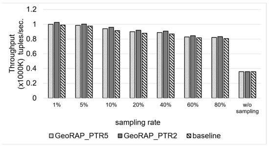 To quantify the gain in the time-based QoS goals, we calculate the throughput as the median (i.e., 50th percentile) of running the same experiments over the same query ten times. Figure 19 shows that GeoRAP outperforms the baseline by roughly 2.6 higher throughput on average. This is attributable to the fact that approximate geo-statistic estimators over geospatial data streams that depend on the theory of stratification involve stateful aggregation, which results in a need to manage state keys stepwise as the system receives data online. Since we are applying a line generalization algorithm at the front stage, we have reduced the number of covering geohash keys, which consequently reduces the number of keys that need to be managed. At 2% “number of PTR”, we reduce the number of keys to manage by roughly 2%. We have noticed that the number of points that fall within the brackets of the discarded geohashes is equal to one point only. This means that we obtain a significant reduction in the number of keys to manage while not compromising the original dataset. This also amplifies the corroboration that only a few points reside on the borders that have been discarded by the simplification algorithm. Those points are considered outliers and do not contribute to the calculation of the geo-statistics.