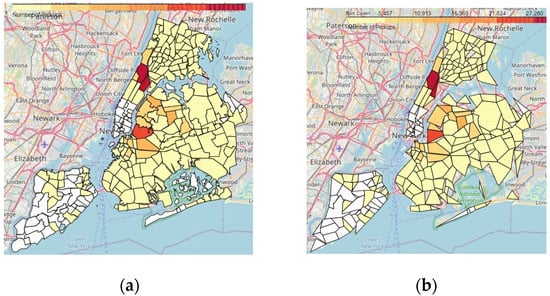 It is obvious that both choropleth maps reveal the same density distribution of taxi pickups in NYC. We use visualizations to reveal patterns, which helps us in making decisions regarding city planning; thus, it is unnecessary for the borders to be accurate for the region-based aggregate geo-maps type of visualization. Although the geo-map in Figure 20b is an approximation, it is sufficient for decision making and urban planning. For example, unleashing the points-of-interest (POIs) that are highly dense to decide so as to show whether those areas are highly affected by higher levels of unhealthy pollutants such as particulate matter (PM10 or PM2) as a consequence of the high circulation of vehicles and the substances delivered by their combustion engines.