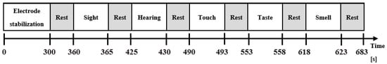 After the application of electrodes to one hand of each of the participants, at least five minutes were required for their stabilization prior to starting the measurements of EDA. Then to test the senses of the participants, they were subjected to five sensory tests, which were vision (sight; looking at a positive nature photo for 5 s), audition (hearing; listening to relaxing (soothing) piano music for 5 s), touch (mild (light) clap on the participant’s shoulder for 3 s), gustation (taste; drinking a spoon of lemon (sour flavor) water for 5 s) and olfaction (smell; inhaling a pleasant odor for 5 s) as shown in Figure 1. Before and after each sensory test, there was a rest time of 60 s. It should be noted that after the tests all participants were asked whether they had, or had not, a feeling of sense for all the separate sensory tests.