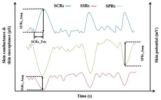 The SCR_Amp, SPR_Amp and SSR_Amp were obtained from the difference between the response maximums (peaks) and the onsets (SCL, SPL and SSL) of SCRs, SPRs and SSRs, respectively. The SCRs_Tris was calculated from the time difference between onset and SCRs peaks. SPRET was calculated by subtracting the SCRs peak time from the SPRs peak time, dividing the result by the SCRs onset time to SCRs peak time, and multiplying the result by 100% [].