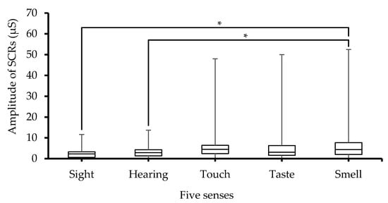 Box-plot with medians, quartiles, and the min and max as whiskers, showing SCRs_Amp in relation to the five senses, * p < 0.05.