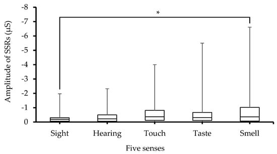 Box-plot with medians, quartiles, and the min and max as whiskers, showing SSRs_Amp in relation to the five senses, * p < 0.05.
