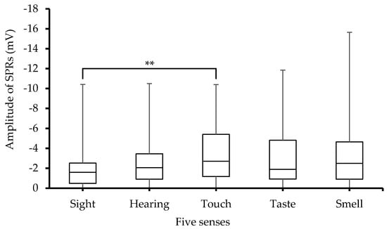 Box-plot with medians, quartiles, and the min and max as whiskers, showing SPRs_Amp in relation to the five senses, ** p < 0.005.