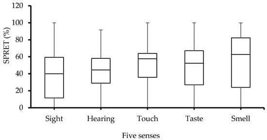 It is clear from the box-plot presented in Figure 6 that the highest SPRET percentage is obtained from the smell sense. Moreover, all SPRET values were between 0% and 100%, which means that no negative SPRET (i.e., SPRET < 0) is seen in line with [,]. As a result, 0% SPRET means that SPRs peaked at the same time as SCRs and a SPRET greater than 0% up to 100% means that SPRs peaked earlier than the SCR peak. In addition, SPRET values depend on the sweat duct filling, in which SPRET tends to be 100% once the sweat duct is already filled to its limp capacity before sweat secretion, and it will be 0% when an empty duct is filled without raising intraductal pressure [].
