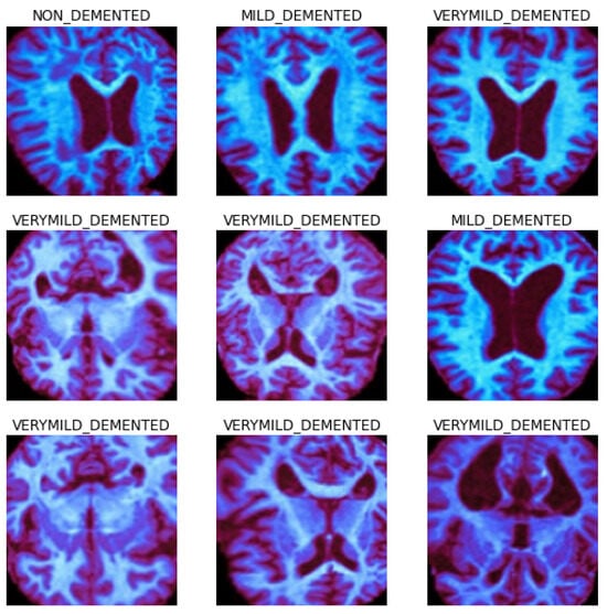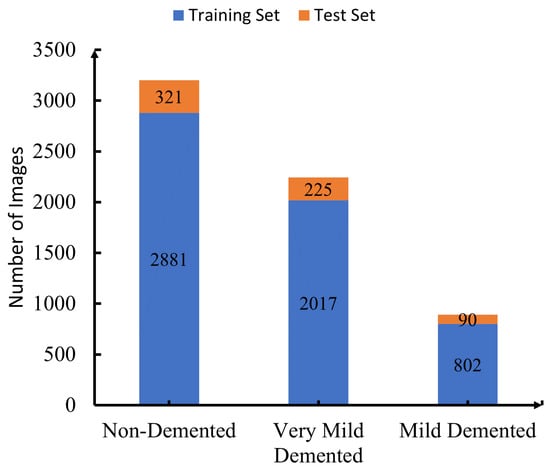 We selected this dataset for its multiple advantages: it is freely accessible, offers a variety of diagnostic classifications, and requires minimal storage capacity, distinguishing it from other widely used datasets in the field. The dataset is an aggregation of 6338 MRI scans. These scans underwent preprocessing and curation before being made publicly available on Kaggle [26]. For standardization, the MRI scans were resized to a uniform resolution of 100 × 100 pixels. The dataset is partitioned into 3202 non-demented, 2242 very mild demented, and 892 mild demented scans. We intentionally excluded the moderate demented category (n = 64) from our analyses to mitigate the influence of sample size bias. Figure 1 presents representative scans from each category within the dataset, and Figure 2 delineates the dataset’s categorical distribution.